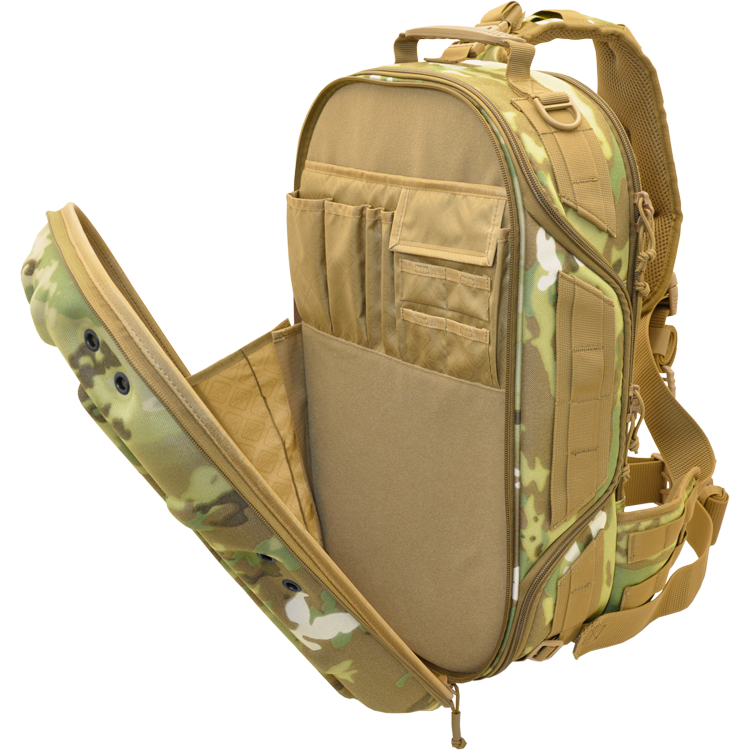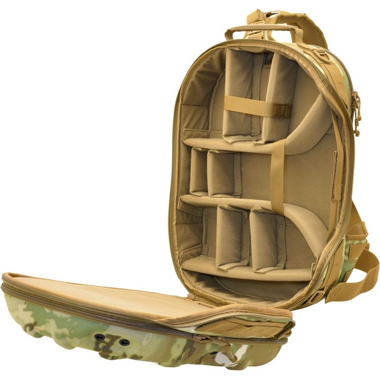 Molded-foam and 360° padded walls protect gear, and support load mounts. The sling configuration allows sliding from back to chest for fast access. Open it all the way up or just from the side-hatch designed for primary camera access while on the chest or sitting sideways. The first pack of its kind to also feature a waist belt to hold heavy loads while allowing sling use as well. Modular padding dividers accommodate cameras, DJI drones, various optics, and electronics, etc. for demanding users like press, travel vloggers, military/agencies, etc. The aesthetics project a progressive technology image for professional use and client work. Padded flat compartments are provided to fit a 16” pc/mac laptop, and a separate tablet. An organization panel hosts accessories like card-readers, sd cards, pens, etc. Personal items like snacks, rain shell, or first aid kits fit into the top shell section; These items are often not allotted for on most photo/digital type packs, but are important since the users are often on their own and outdoors for extended time. The top shell has 6 spots for our patented Hardpoint® parts allowing optional attachment of loops, lights, bungee systems, MOLLE panels, etc. This pack is also very suitable for motorcycle use as it won't flap in the wind. The molded back-pad is abrasion resistant while conforming to the spine and ventilating sweat. Military modular webbing (MOLLE) is provided throughout on the sides and strap, while the interior is lined with fuzzy tricot for expansion with pouches, velcro i.d. patches, etc. YKK® Zippers, real Cordura® 1000D nylon (Scorpion model is similar 600D Polyester) and reinforcing stitch patterns ensure lasting quality. Our patented locking roto-buckle is used on the main strap, as is our patented photo-d-ring which allows mounting of ¼-20” screw equipment like cameras as a leash. ¼-20” screw ports are also provided on the hard-MOLLE polymer strips to add lighting, grips, etc. See the details below for the full feature set.