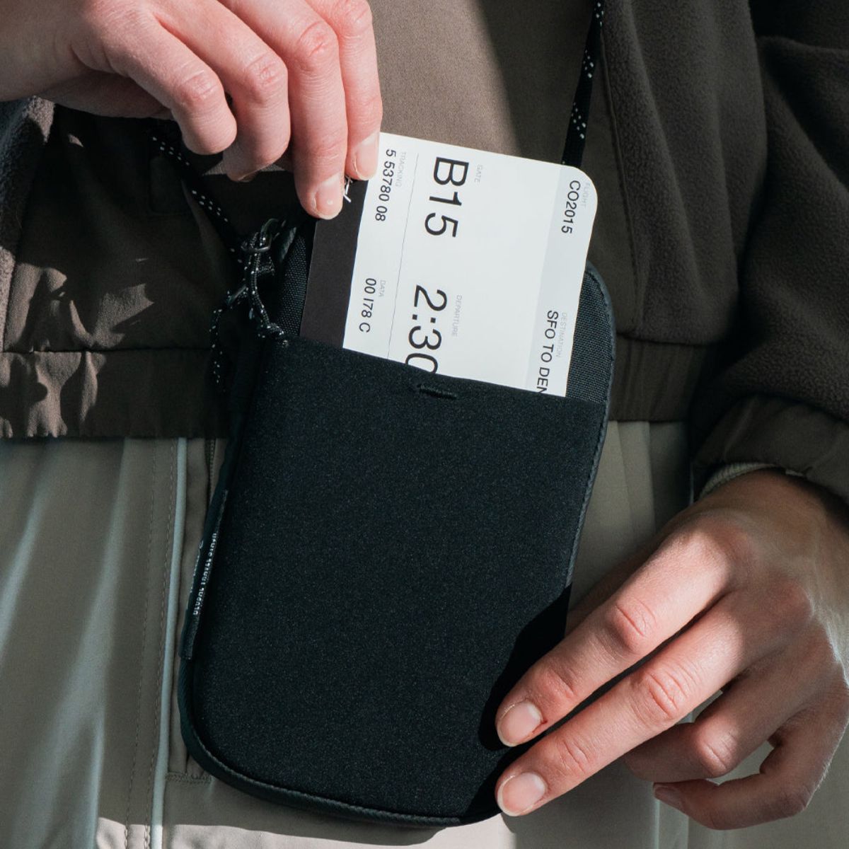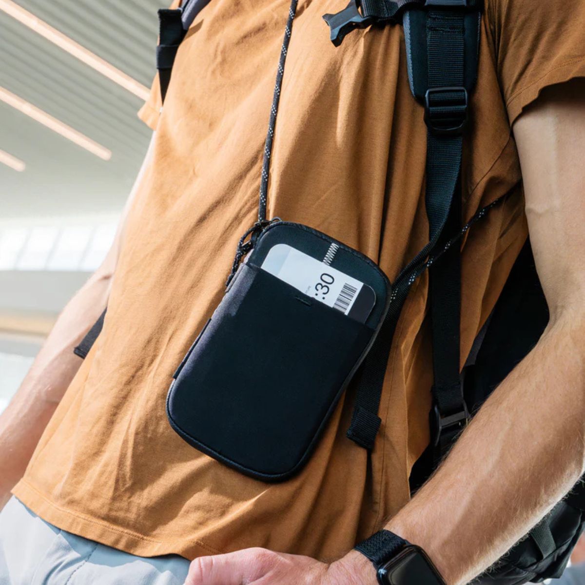 Everything stays organized: passport, cash, cards, coins, pen, keys, location tracker; each in their place. The stowable lanyard lets you carry it as a wallet, wear it around your neck, or go crossbody — under or over your clothes.