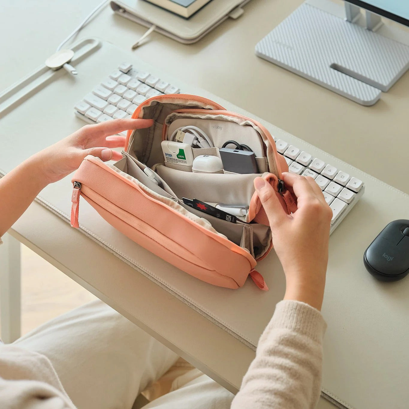 A clever twin pouch organisation system that says yes to storing your essentials with ease. The unique 2-in-1 design means that you'll have quick access to all your belongings whether you're on the go, at your desk or anywhere in between.